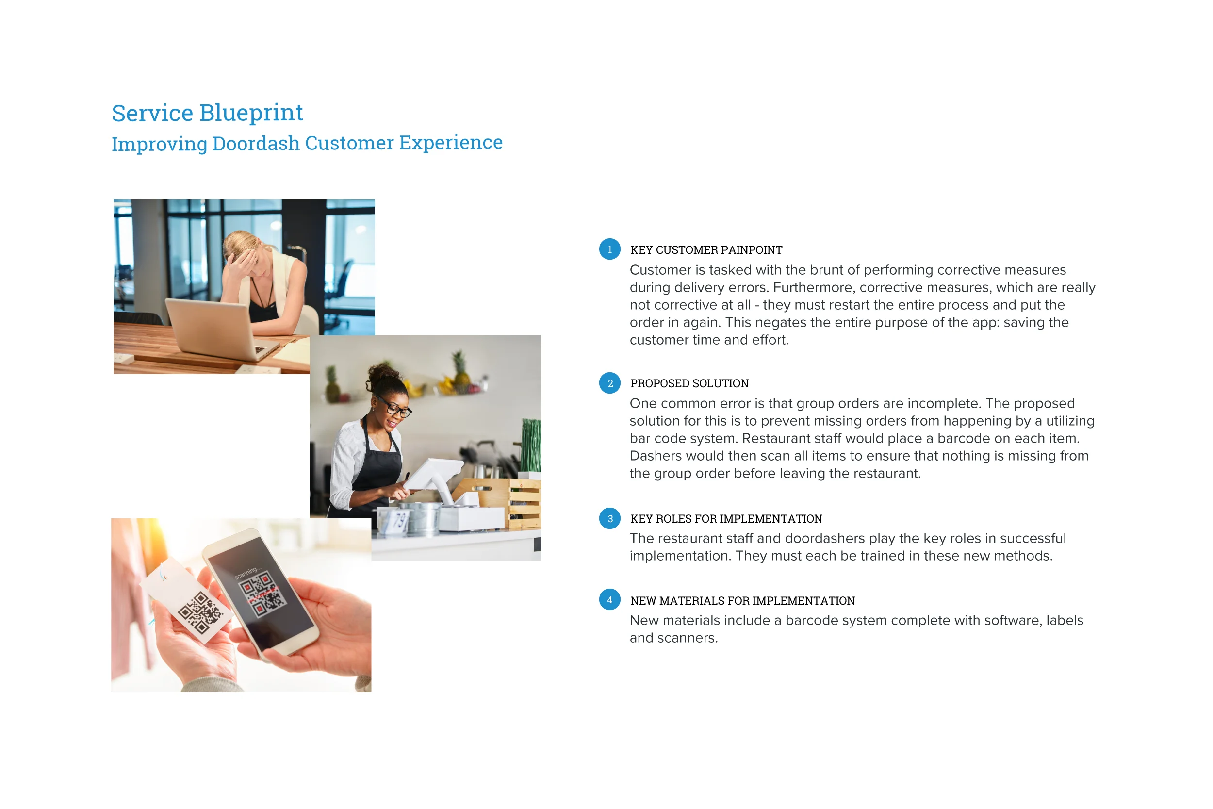 Next, I brainstormed different solutions and settled on one: Prevent missing orders from even happening by a utilizing bar code system (before leaving the restaurant, dashers would scan all items to ensure that nothing is missing from the group order).